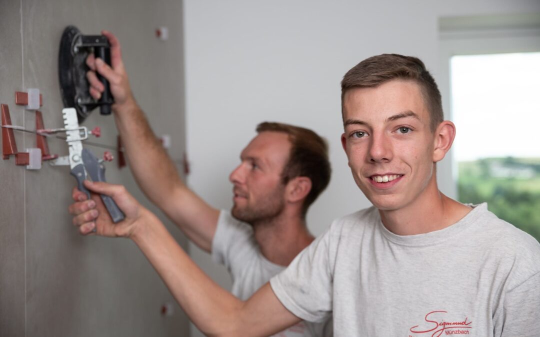 Zwei Männer bei der Wandarbeit, einer hält ein Werkzeug, beide in grauen T-Shirts.